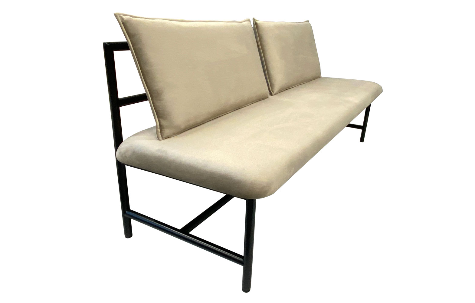 Element liniar cu cadru din tub de otel vopsit in camp electrostatic cu pulbere (de diverse nuante), perne de sezut din spuma poliuretanica cu placaj multistrat si perne de spate din puf siliconic si poliester, protejate de husa detasabila si acoperite cu tesaturi de interior sau exterior.