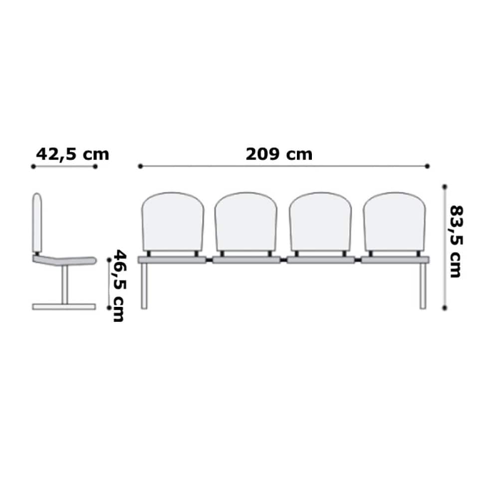 Bancuta cu patru locuri, cadru rezistent din teava de otel vopsit in camp electrostatic, sezut si spatar tapitat din lemn stratificat lacuit.
