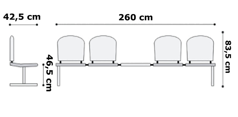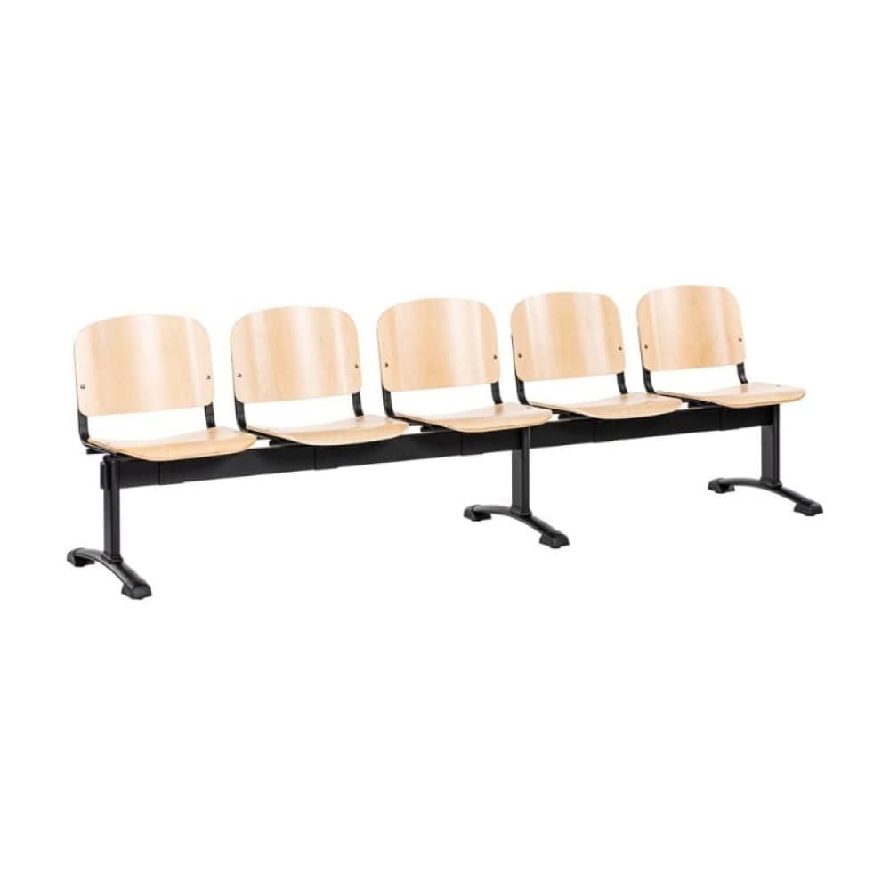 Bancuta cu cinci locuri, cadru rezistent din teava de otel vopsit in camp electrostatic, sezut si spatar tapitat din lemn stratificat lacuit.