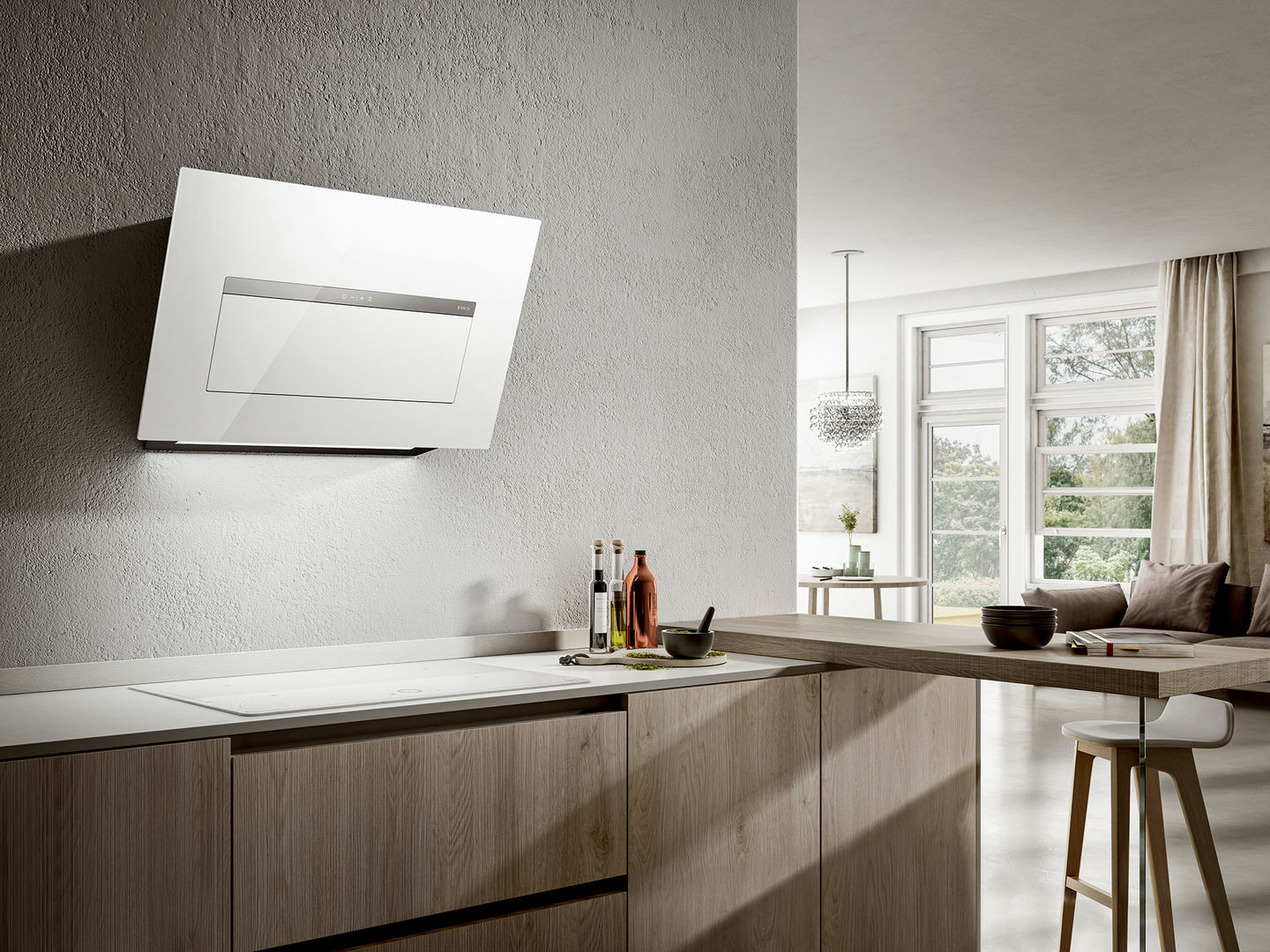 Hota Elica BLOOM-S WH/A/85 sticla alba PRF0164490 verticala montata pe perete.