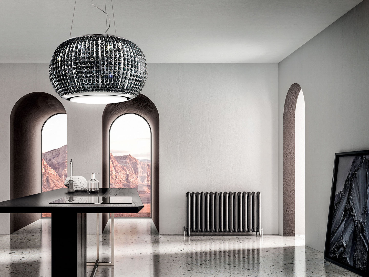 Pornind de la liniile conceptuale ale produsului iconic Star, Interstellar combina otelul lustruit cu oglinda si 1150 de pahare, care fac produsul deosebit de pretios, plin de lumina si capabil sa creeze o atmosfera unica.