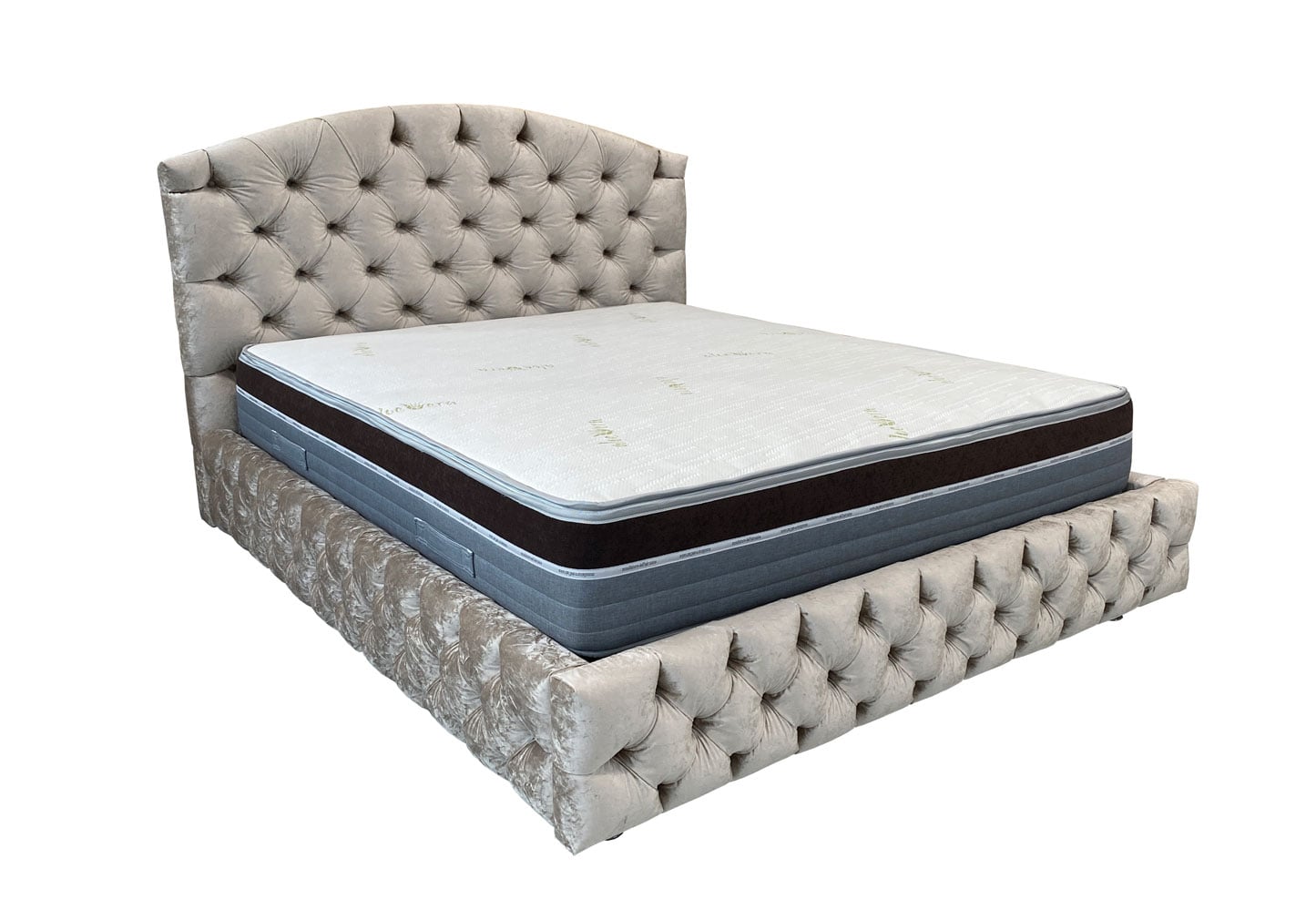 Structura patului este acoperita cu un material textil care este fixat cu nasturi, dandu-i un aspect capitonat si elegant. Este prevazut cu o lada de depozitare sub pat, oferind spatiu suplimentar pentru depozitarea lenjeriei de pat sau a altor obiecte. Materialul textil folosit este sau catifea de culoare gri gheata, adaugand un element de eleganta si confort.