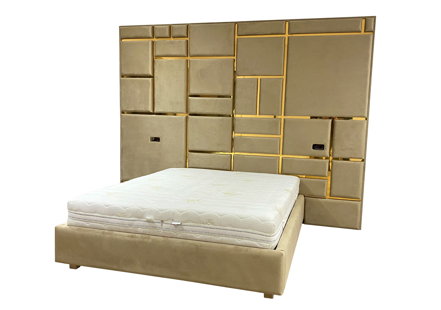Pat tapitat NEW YORK cu tablie model de lux cu profil banda decorativa din otel, auriu lucios si box lada depozitare