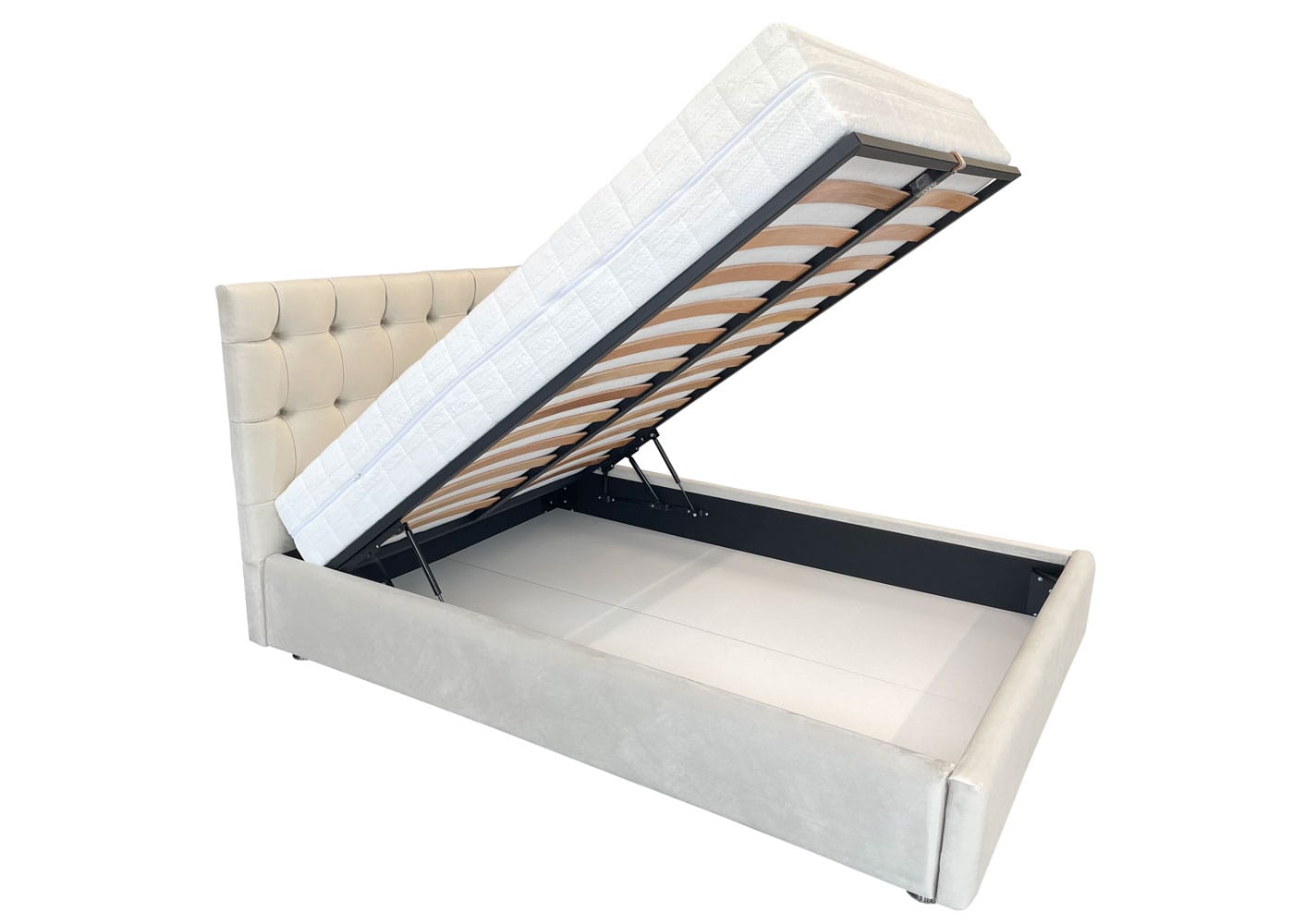 Pat tapitat PORTO capitonat cu pliuri si lada de depozitare sistem mecanism de ridicare