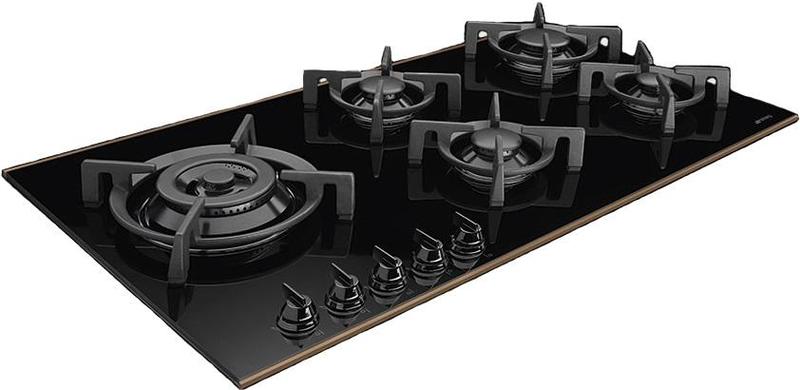 Plita pe gaz, 90 cm, ceramica din sticla neagra, finisare componente din cupru, marginea dreapta