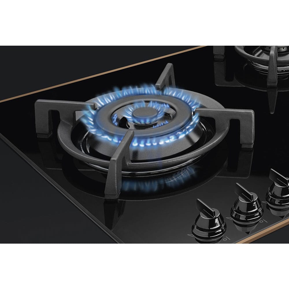 Plita pe gaz, 70 cm, ceramica din sticla neagra, finisare componente din cupru, marginea dreapta